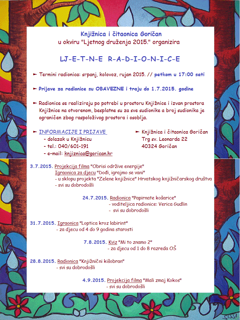 Knjižnica i čitaonica Goričan u okviru "Ljetnog druženja 2015." organizira LJETNE RADIONICE. Prijave za radionice su OBAVEZNE i traju do 1.7.2015. godine.